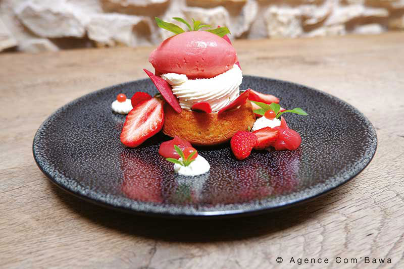 4- Imbiber les babas avec le sirop, les déposer sur l’assiette avec la mousse et les fraises. Déguster selon l’envie.